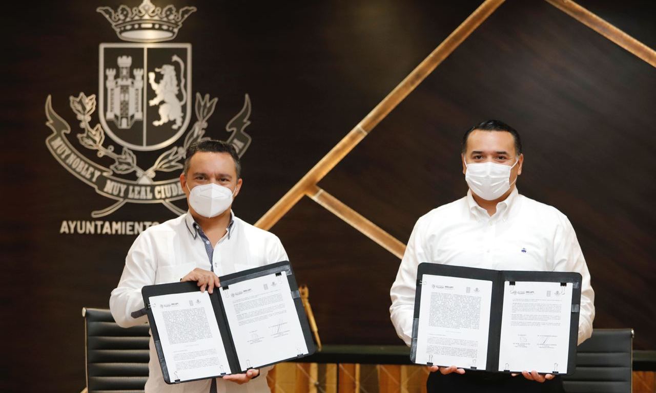 Mérida, Yucatán a 23 de noviembre de 2021. En una suma de esfuerzos para continuar mejorando los procesos catastrales en el Municipio, esta mañana el Ayuntamiento de Mérida suscribió un convenio de colaboración con el Instituto de Seguridad Jurídica Patrimonial de Yucatán (INSEJUPY), en donde las y los ciudadanos que soliciten su cédula catastral cuenten con una mejor atención y certeza jurídica al momento de hacer sus trámites, informó el Alcalde, Renán Barrera Concha.