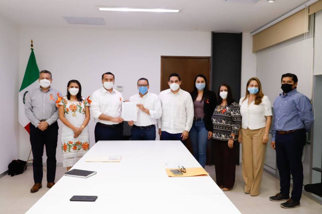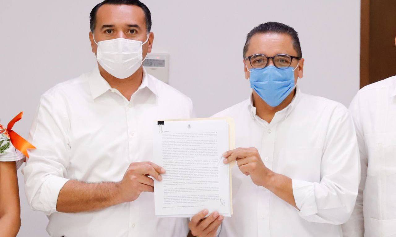 Acompañado por Alejandro Ruz Castro, Secretario Municipal, y Laura Muñoz Molina, directora de Finanzas y Tesorería, Barrera Concha entregó el paquete fiscal a Víctor Hugo Lozano Poveda, Diputado Presidente de la Junta de Gobierno y Coordinación Política del Congreso del Estado de Yucatán y a Anguiano Aguilar, secretario general del Poder Legislativo del Estado de Yucatán.
