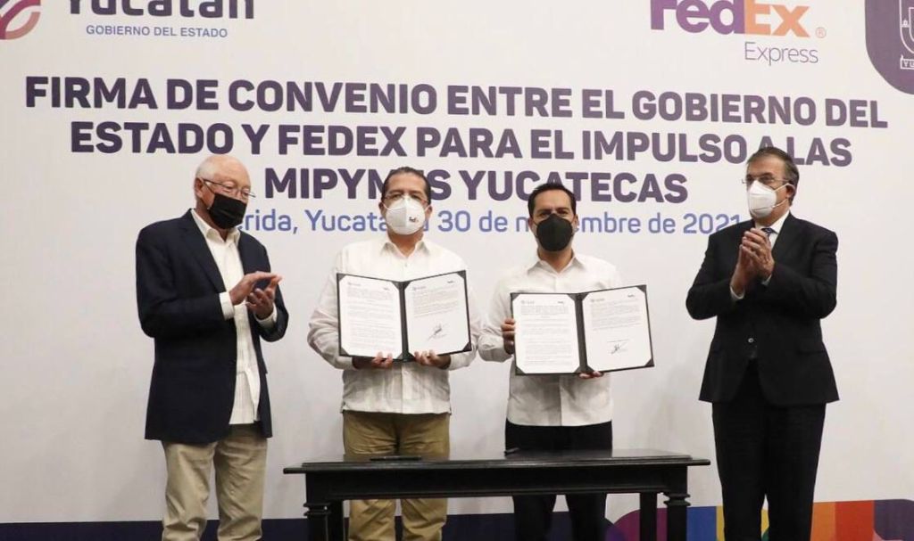 Mérida, Yucatán, 30 de noviembre de 2021.- Micro, pequeñas y medianas empresas podrán acceder a descuentos de hasta el 40% en envíos nacionales e internacionales, para facilitar que su mercancía llegue a todo México y más de 200 países, luego de que el Gobernador Mauricio Vila Dosal y directivos de la importante compañía de logística FedEx firmaron un convenio de colaboración durante el Segundo Encuentro de Gobernadores del Sureste y la Embajada de los Estados Unidos.