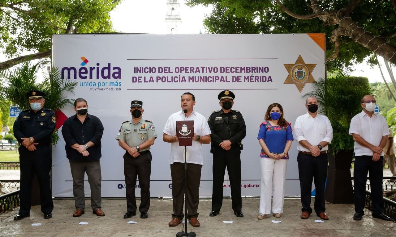 Mérida, Yucatán, 2 de diciembre de 2021.- Ante la reactivación económica y el incremento de la actividad comercial en el Centro Histórico, el Alcalde, Renán Barrera Concha, encabezó esta mañana el arranque del Operativo Decembrino de la Policía Municipal de Mérida para garantizar la seguridad y tranquilidad de las familias.