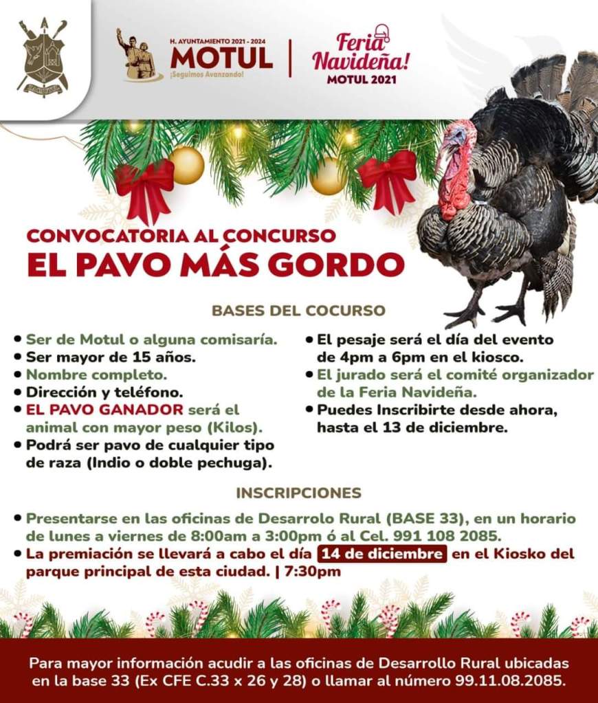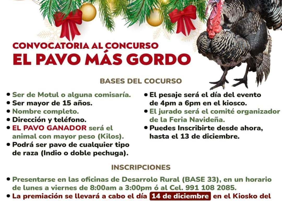 El H. Ayuntamiento de Motul hace una atenta invitación a todos los ciudadanos motuleños a participar en el concurso «El pavo más gordo» el cual se realizará el próximo 14 de diciembre.