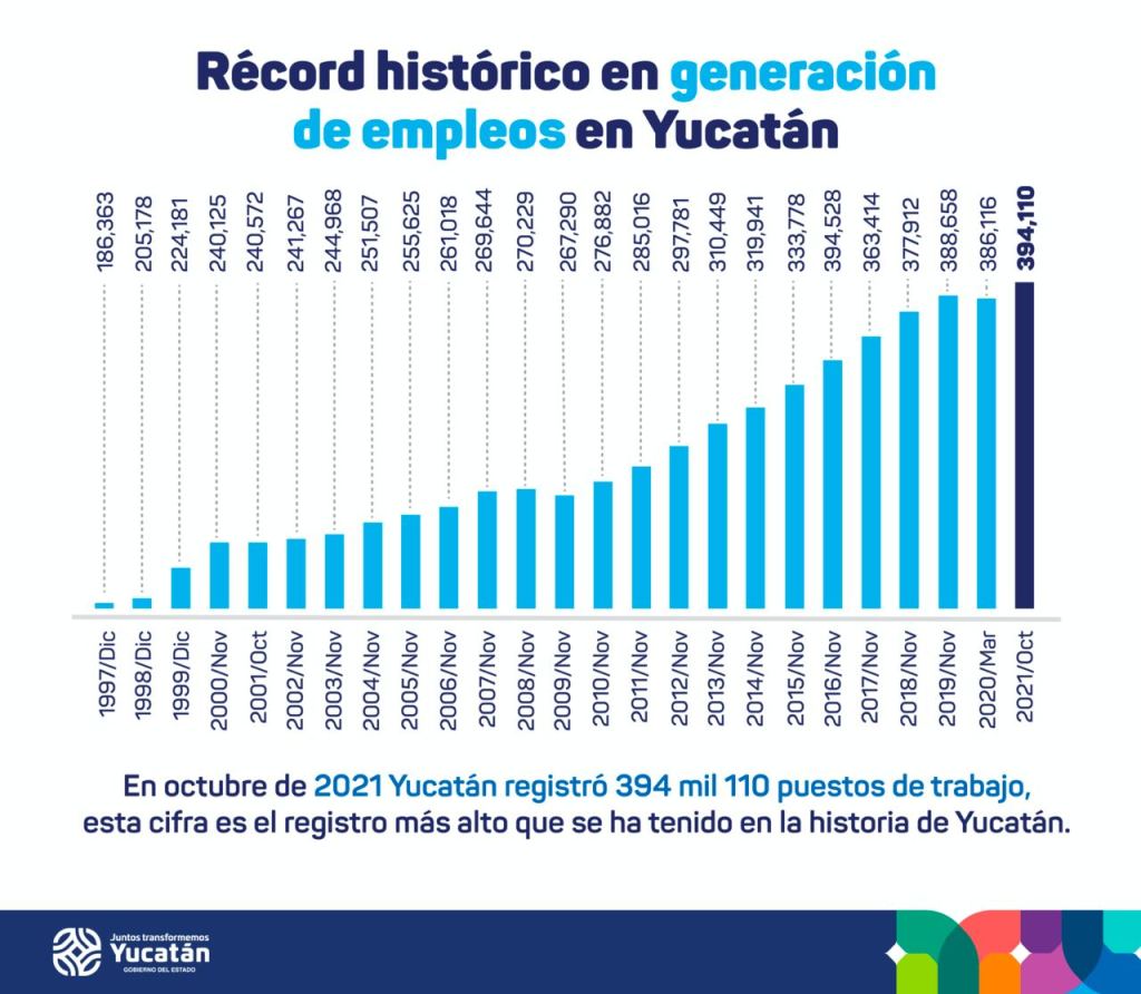 Mérida, Yucatán, 4 de diciembre de 2021.- Yucatán registró cifras históricas en generación de empleos y que demuestran la total recuperación de las plazas que se perdieron por la pandemia, ya que, al cierre de octubre de 2021, se cuenta con 394 mil 110 empleos ante el Instituto Mexicano del Seguro Social (IMSS).