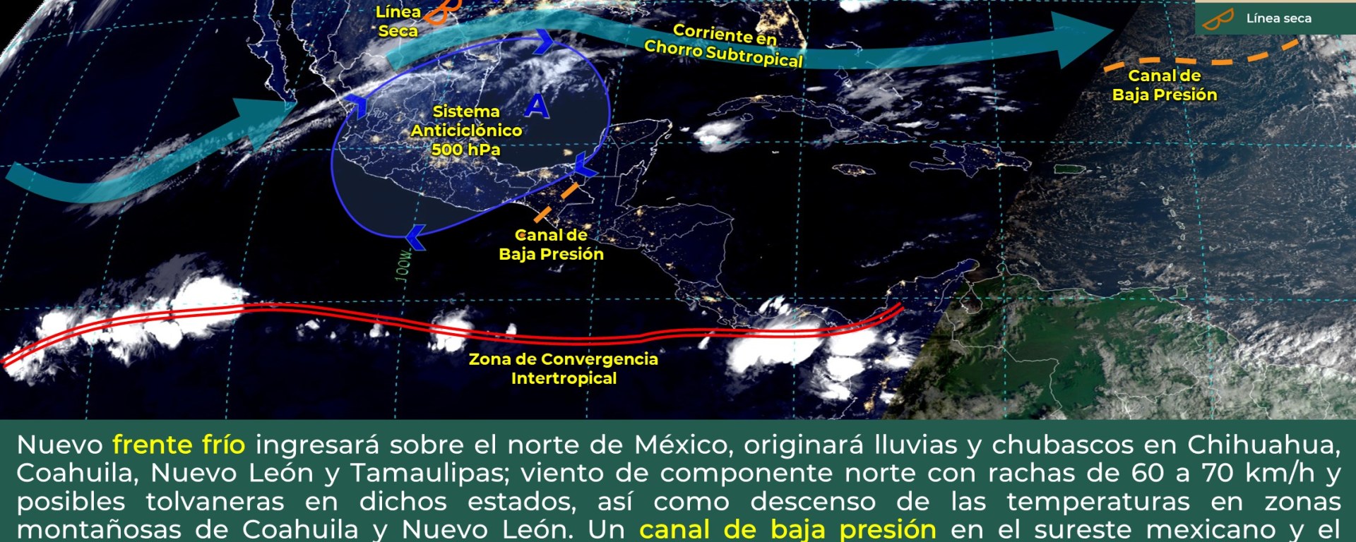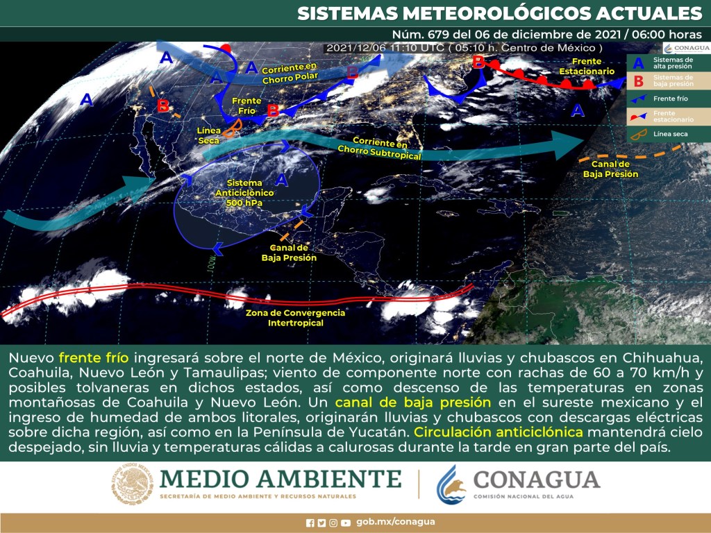 Una vaguada sobre la región y el ingreso de aire marítimo tropical proveniente del mar Caribe y golfo de México hacia la península de Yucatán, mantendrán condiciones de cielo despejado a parcialmente nublado con probabilidad para lloviznas e intervalos de chubascos dispersos sobre la porción norte y