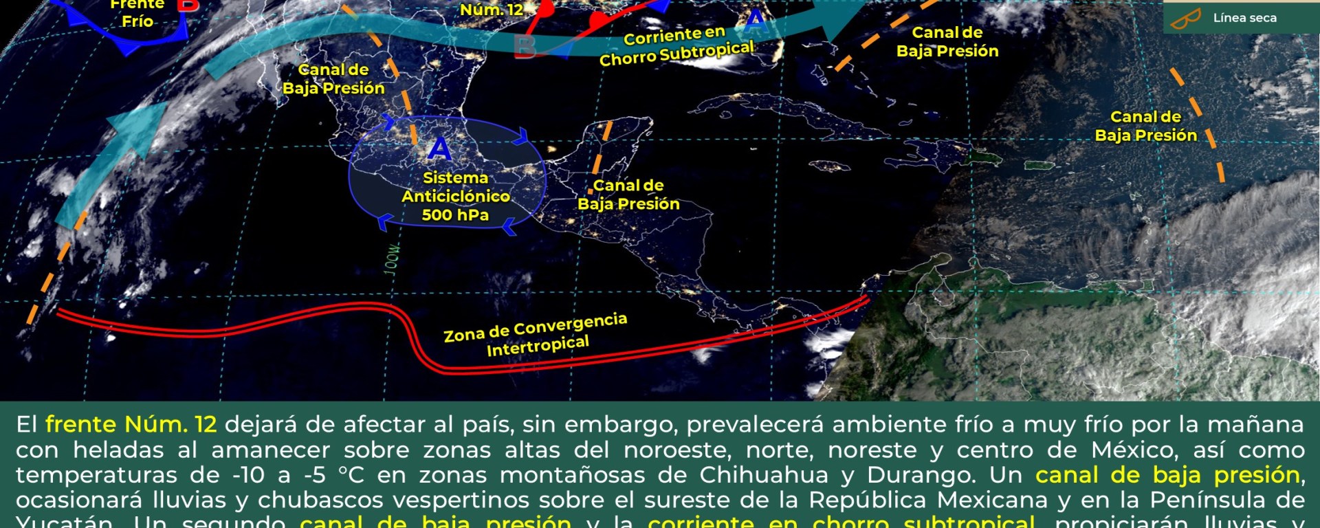 Durante el día martes en Yucatán no se tuvieron lluvias significativas; la temperatura máxima fue de 34.0 °C registrada en Cantamayec y en Mérida (observatorio) fue de 33.2 °C; la mínima fue de 17.0 °C registrada en Mococha y Motul. La temperatura más baja en lo que va de la presente temporada es de 9.5 °C observada en Motul el día 9 de noviembre. Para mayor información consultar https://Twitter.com/conaguayucatan.