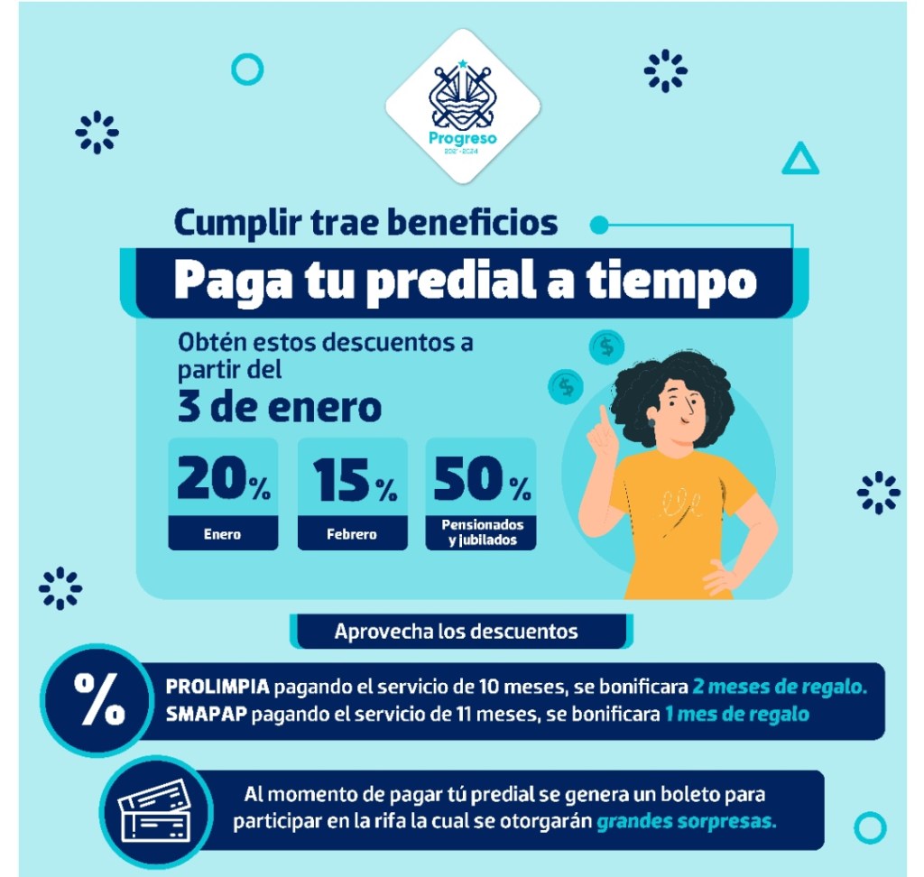 Durante el mes de enero obtén el 20% de descuento en el pago de impuesto predial sobre el ejercicio fiscal 2022, al mismo tiempo podrás pagar tu servicio de recolección de basura en PROLIMPIA con el beneficio que al pagar lo correspondiente a diez meses del servicio se bonificarán dos meses de regalo, y pagando el servicio de agua potable SMAPAP con el beneficio de pagar once meses del servicio y se bonificara un mes de regalo.