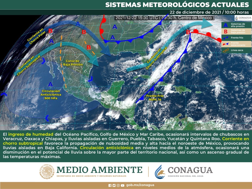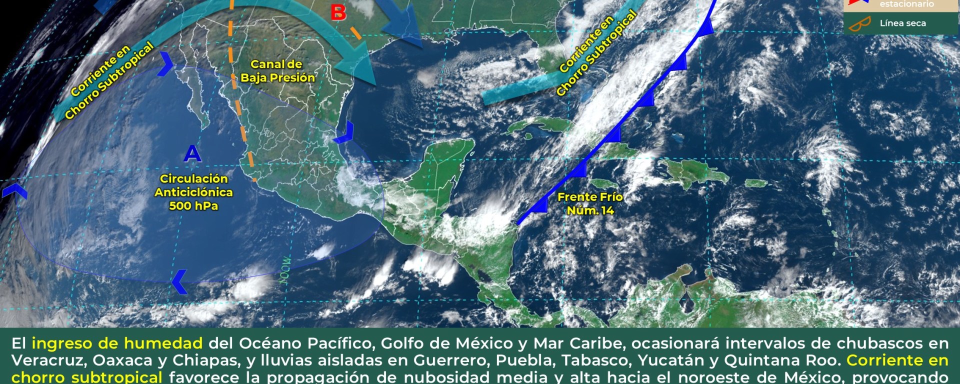 Durante este día, la masa de aire frío que impulsó al frente frío No.14 cubrirá gran parte del golfo de México y el oriente y sureste del territorio nacional, favoreciendo condiciones de tiempo estable con cielo despejado a parcialmente nublado, además de escasa probabilidad para lluvias en la región. Las