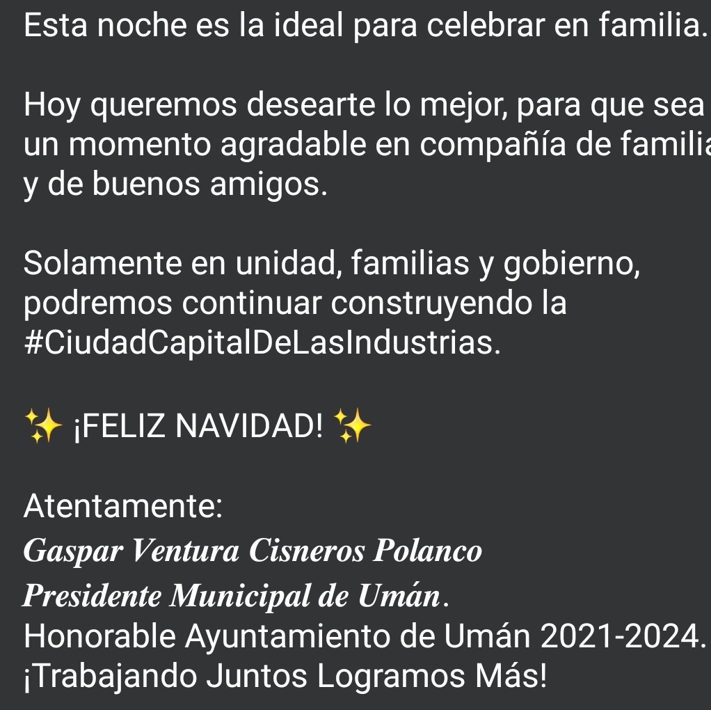 UmánEl alcalde de Umán, Gaspar Ventura Cisneros Polanco desea feliz Navidad Comparte esto: Haz clic para enviar un enlace por correo electrónico a un amigo (Se abre en una ventana nueva) Correo electrónico Más Haz clic para compartir en Facebook (Se abre en una ventana nueva) Facebook Haz clic para compartir en X (Se abre en una ventana nueva) X Me gusta Cargando...
