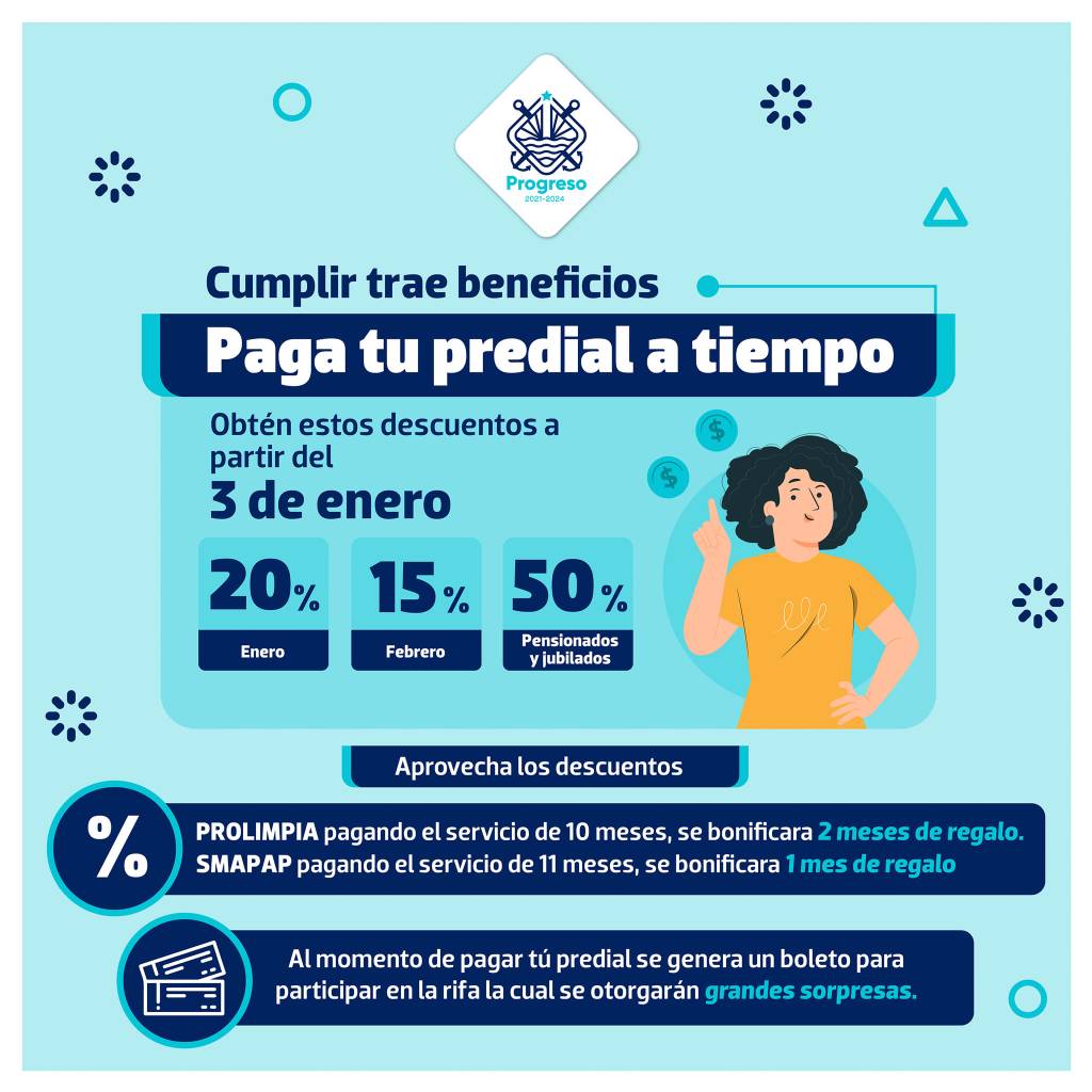 Las promociones son: en el mes de enero obtén el 20% de descuento en el pago de impuesto predial sobre el ejercicio fiscal 2022, al mismo tiempo podrás pagar tu servicio de recolección de basura en PROLIMPIA con el beneficio que al pagar lo correspondiente a diez meses del servicio se bonificarán dos meses de regalo, y pagando el servicio de agua potable SMAPAP con el beneficio de pagar once meses del servicio y se bonificara un mes de regalo.