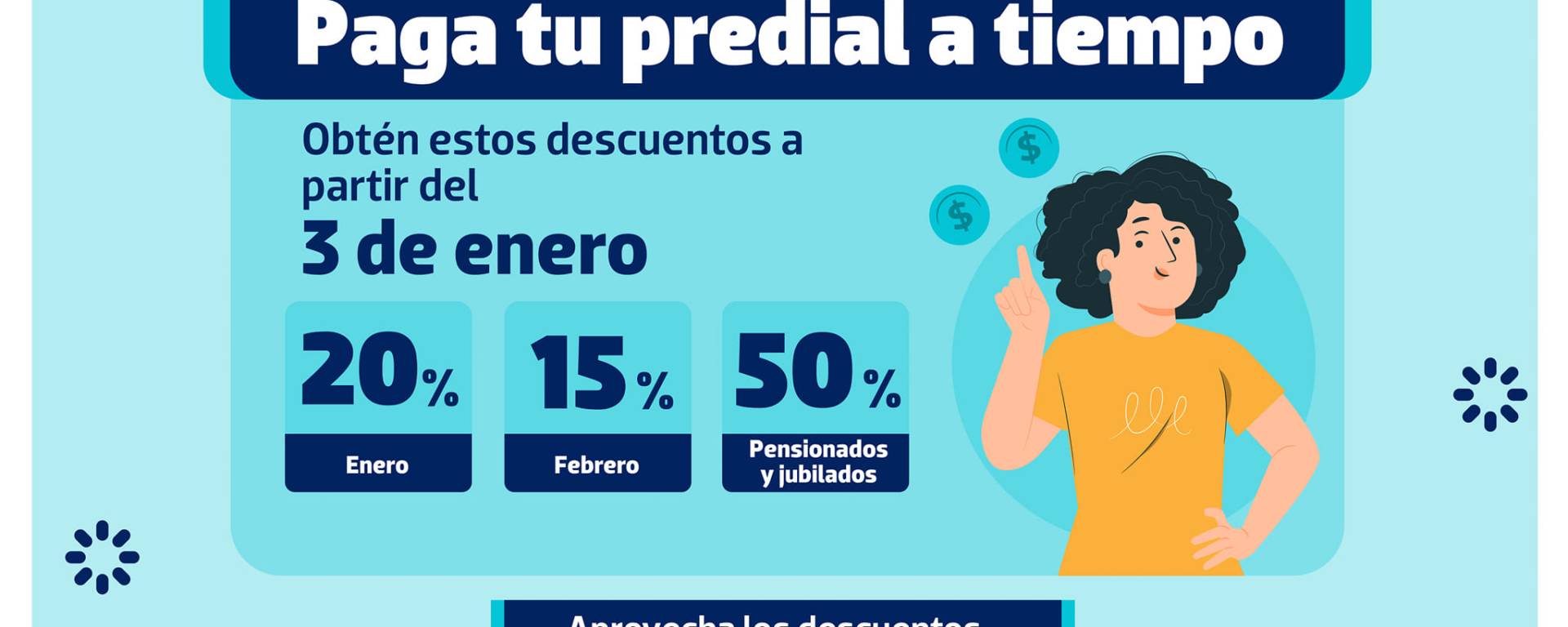 Las promociones son: en el mes de enero obtén el 20% de descuento en el pago de impuesto predial sobre el ejercicio fiscal 2022, al mismo tiempo podrás pagar tu servicio de recolección de basura en PROLIMPIA con el beneficio que al pagar lo correspondiente a diez meses del servicio se bonificarán dos meses de regalo, y pagando el servicio de agua potable SMAPAP con el beneficio de pagar once meses del servicio y se bonificara un mes de regalo.