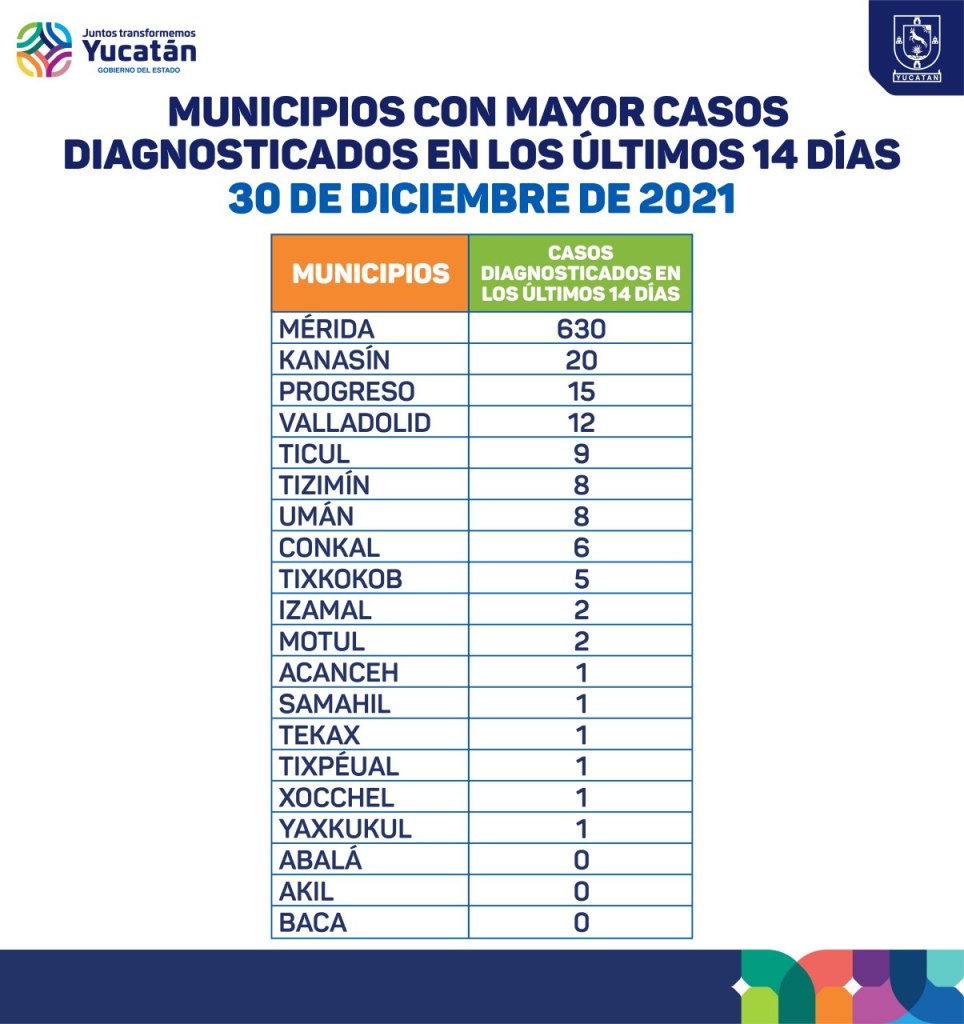 LOS MUNICIPIOS DE YUCATÁN CON MAYOR NÚMERO DE CASOS DIAGNOSTICADOS EN LOS ÚLTIMOS 14 DÍAS SON: