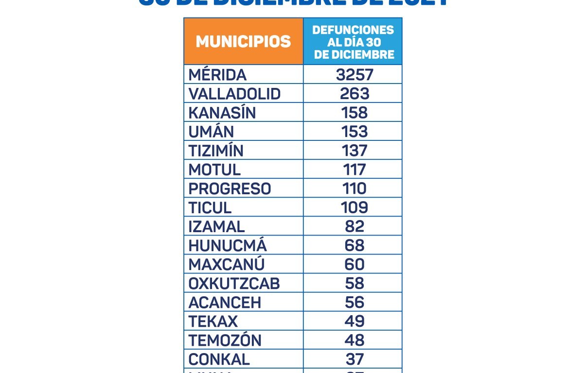 LOS MUNICIPIOS DE YUCATÁN CON MAYOR NÚMERO DE DEFUNCIONES AL DÍA 30 DE DICIEMBRE DE 2021 SON: