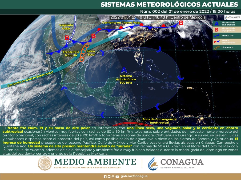 Se prevé condiciones de buen tiempo y ambiente caluroso durante esta mañana, sin embargo, se espera el incremento de nublados durante la tarde y lluvias intermitentes a partir del atardecer. Una vaguada prefrontal y la cercanía del frente frío no. 19 con nuestra región, ocasionarán intervalo de chubascos con tormentas fuertes en Yucatán, así como tormentas fuertes a muy fuertes en el sur y centro de Campeche y de Quintana Roo. Las temperaturas serán calurosas a muy calurosas cerca del mediodía y cálidas al