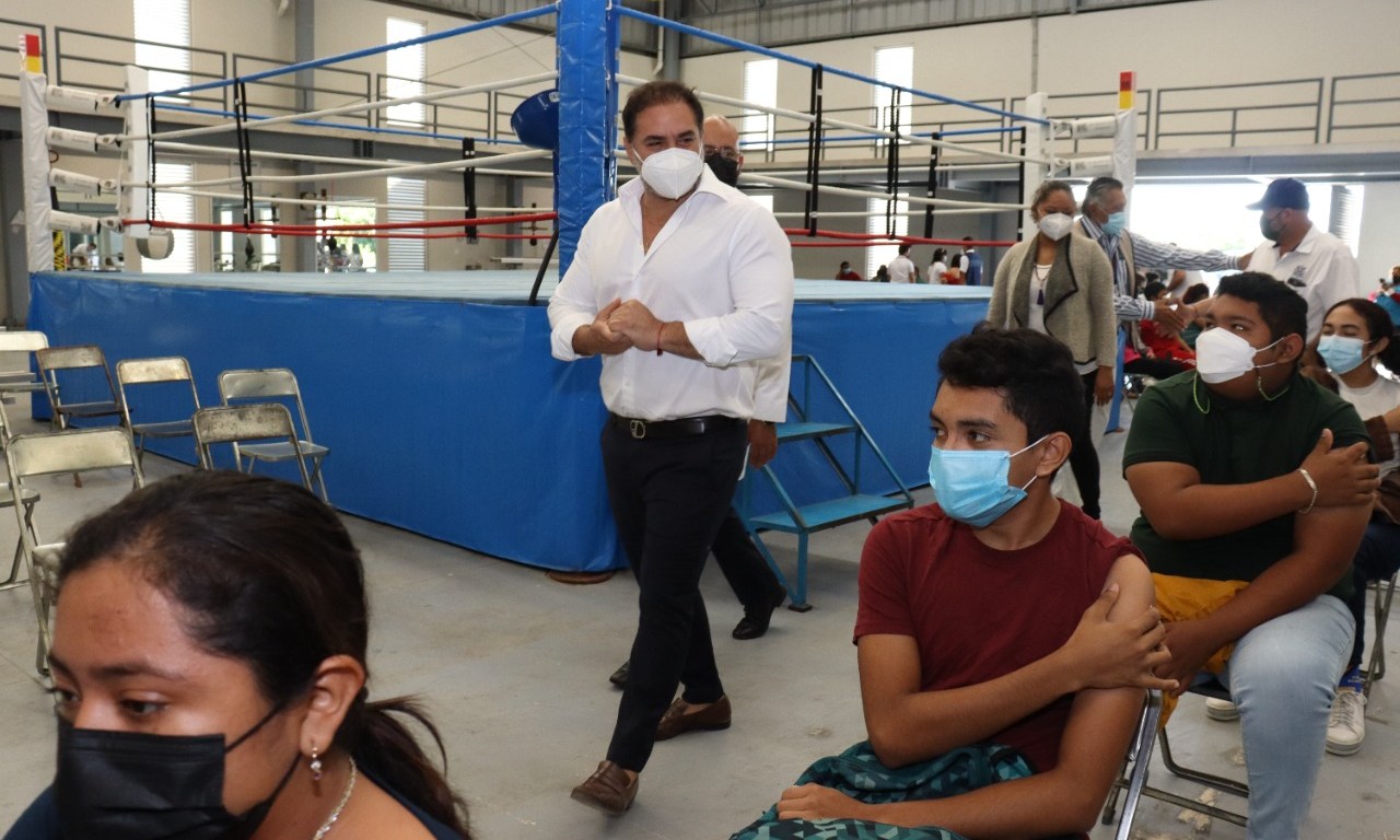 Progreso, Yucatán a 6 de enero 2022.- Esta mañana el alcalde Julián Zacarías Curi visito la Unidad Deportiva Víctor Cervera Pacheco para supervisar la jornada de vacunación, de la segunda dosis contra el Covid-19 a los jóvenes de 15 a 17 años.
