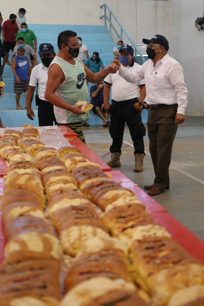 Mérida, Yucatán, 7 de enero de 2022.- Como parte de las acciones de convivencia, trabajo en equipo, fomento a la productividad en el trabajo y empatía hacia las tradiciones, las personas privadas de su libertad en el Centro de Reinserción Social (Cereso) de Mérida participaron en la elaboración de una rosca de Reyes de 300 metros de largo.