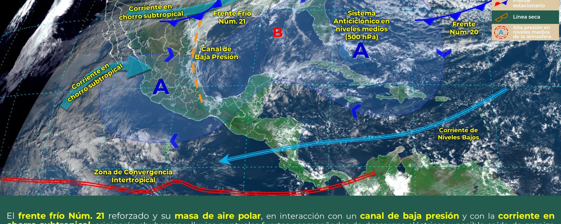 península de Yucatán estarán generando ingreso de aire cálido y húmedo del mar Caribe, situación que ocasionará intervalo de chubascos con tormentas en el sur y norte de Quintana Roo, así como en el sur y