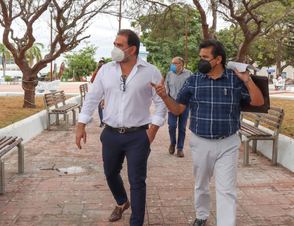 Progreso Yucatán a 13 de enero 2022.- El alcalde Julián Zacarías Curi hizo un recorrido de revisión en el Parque Independencia, para hacer una valoración de las instalaciones y mobiliario urbano.