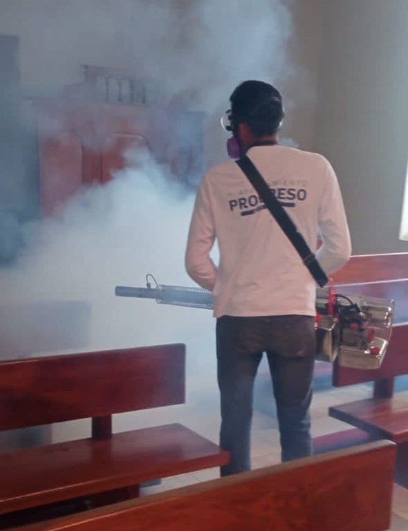 Progreso, Yucatán a 15 de enero de 2022. Escuelas, iglesias, transporte público, vehículos oficiales, clínicas, comisarías así como todas las oficinas del Ayuntamiento de Progreso continúan siendo sanitizadas por parte de la Subdirección de Ecología, a fin de contrarrestar los efectos de la pandemia por COVID-19 en el municipio.