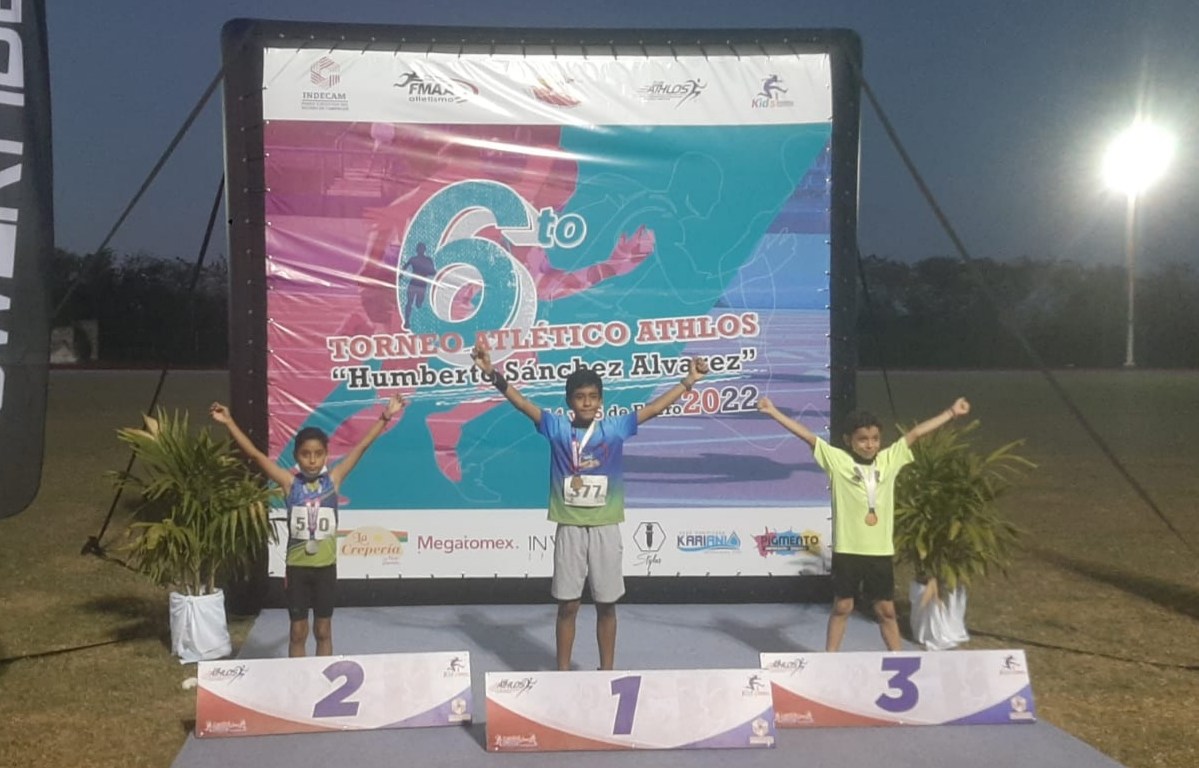 Cinco medallas fue la cosecha que la Escuela Municipal de Atletismo del Ayuntamiento de Mérida logró en la VI edición del Torneo Atlético Athlos 2022 “Humberto Sánchez Álvarez”, que se desarrolló este viernes y sábado, en la pista de atletismo del Centro Estatal de Alto Rendimiento (CEDAR), en Campeche, y que se realizó con todas las medidas sanitarias pertinentes, para salvaguardar la salud de atletas, y público en general. Dos oros, la misma cantidad de platas y un bronce fue el resultado que obtuvo el equipo que entrena en la Unidad Deportiva de Ciudad Caucel, bajo el mando del profesor Henry Chávez Quintal. Los metales cayeron por conducto de Nicole Aguilar Narvaez, quien se colgó dos preseas. Una de oro en salto de longitud, con marca de 3.99 mts, y plata en los 600 metros, con marca de 1:53.06. Por su parte, Efraín Pascacio consiguió tres medallas; el primer lugar en salto de longitud, con una marca de 2.20 metros; segundo puesto en los 300 metros, con 51 segundos; y con registro de 23.16 segundos en los 150 metros, obtuvo el tercer peldaño. Asimismo, cabe destacar la actuación de Camila Martínez López, que obtuvo el cuarto lugar en los 600 metros, con un registro de 1:55.81. En el evento vieron acción atletas de Estados como Chiapas, Tabasco, Tlaxcala, Veracruz, Estado de México, Quintana Roo, Yucatán y el anfitrión Campeche.