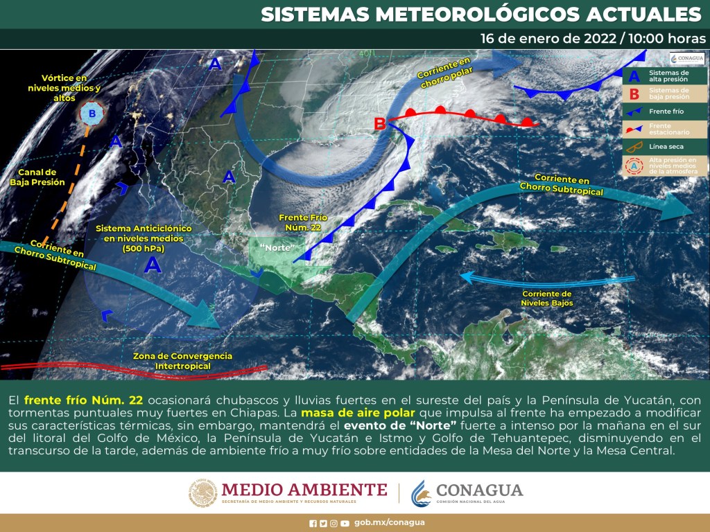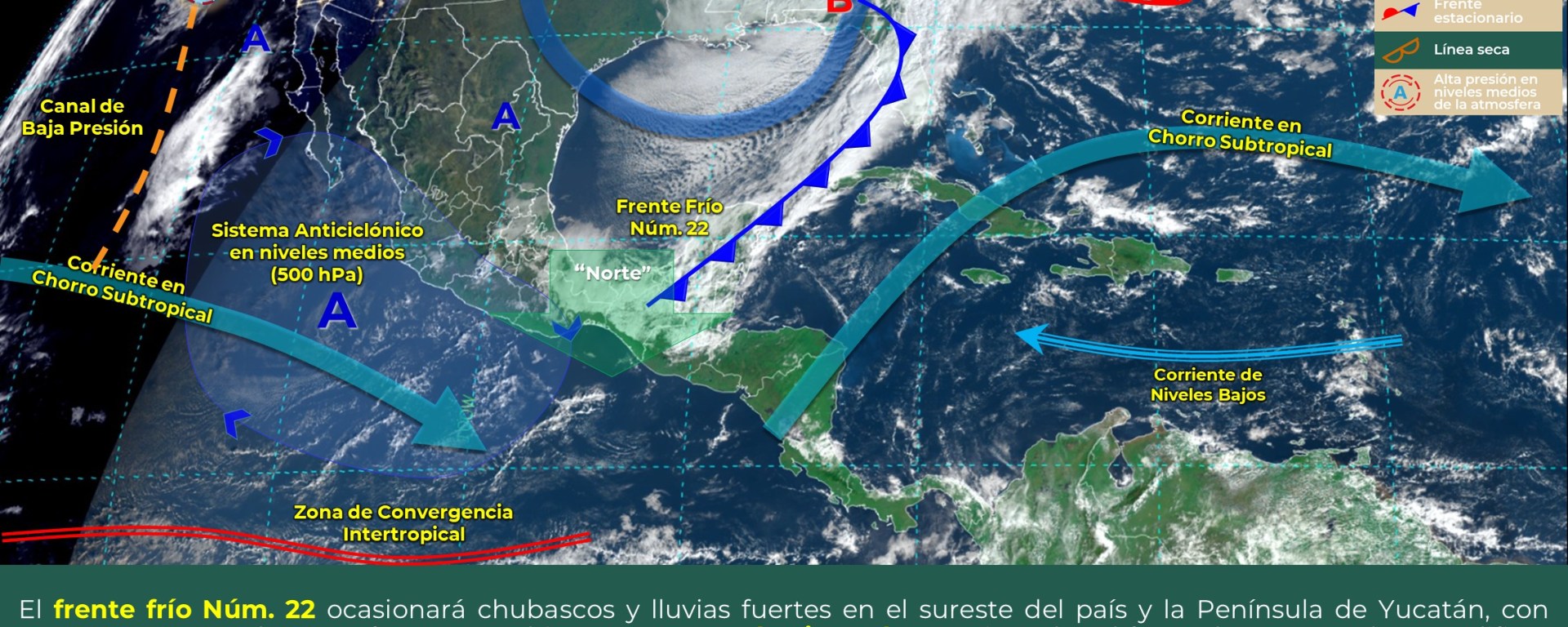 El paso del frente frio No. 22 sobre la península de Yucatán y su masa de aire frio estarán generando evento de norte con rachas superiores a 65 km/h, así como chubascos y lluvias fuertes en el norte, centro y noreste de Yucatán, sur y suroeste de Campeche, así como en gran