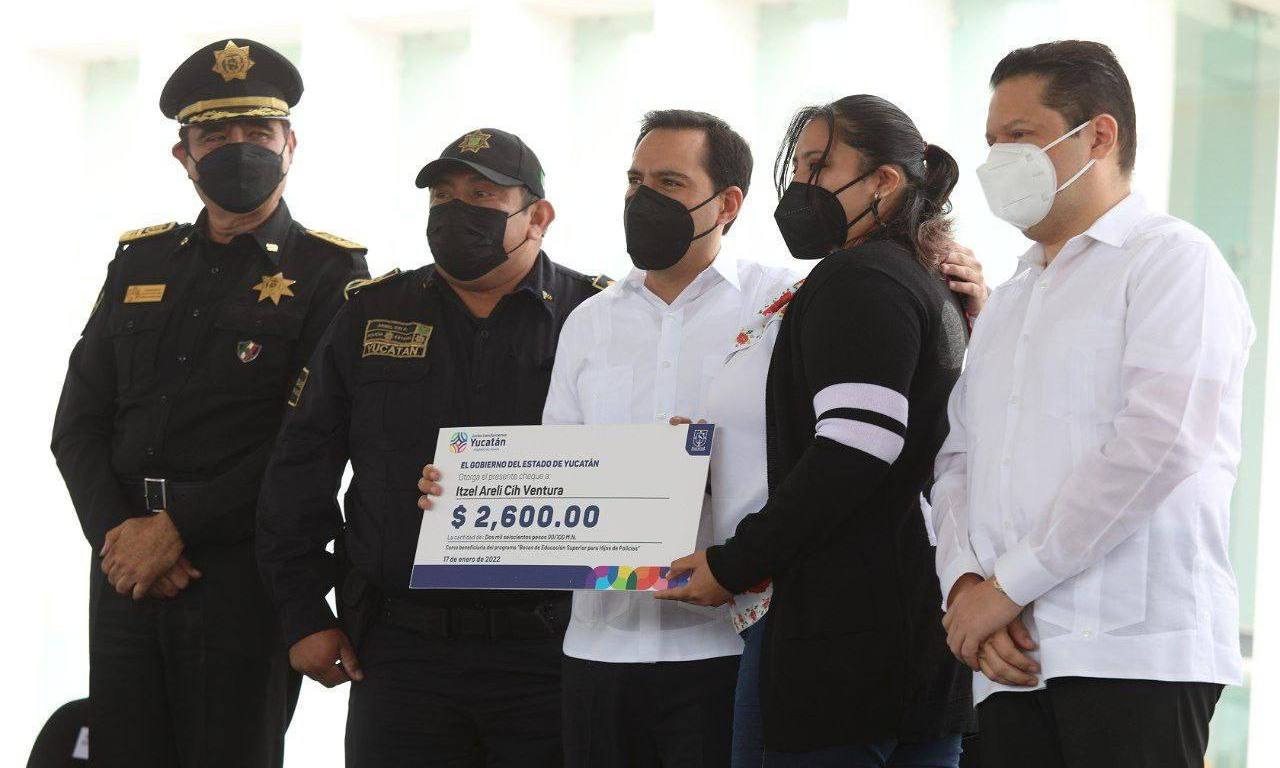 -Vila Dosal entregó apoyos de 2,600 pesos bimestrales pesos para gastos de alimentos y transporte dirigidos a los hijos de los agentes de la corporación estatal, que se suman a la beca de inscripción y colegiatura del 100% para que estudian en cualquier universidad del estado ya pública o privada.