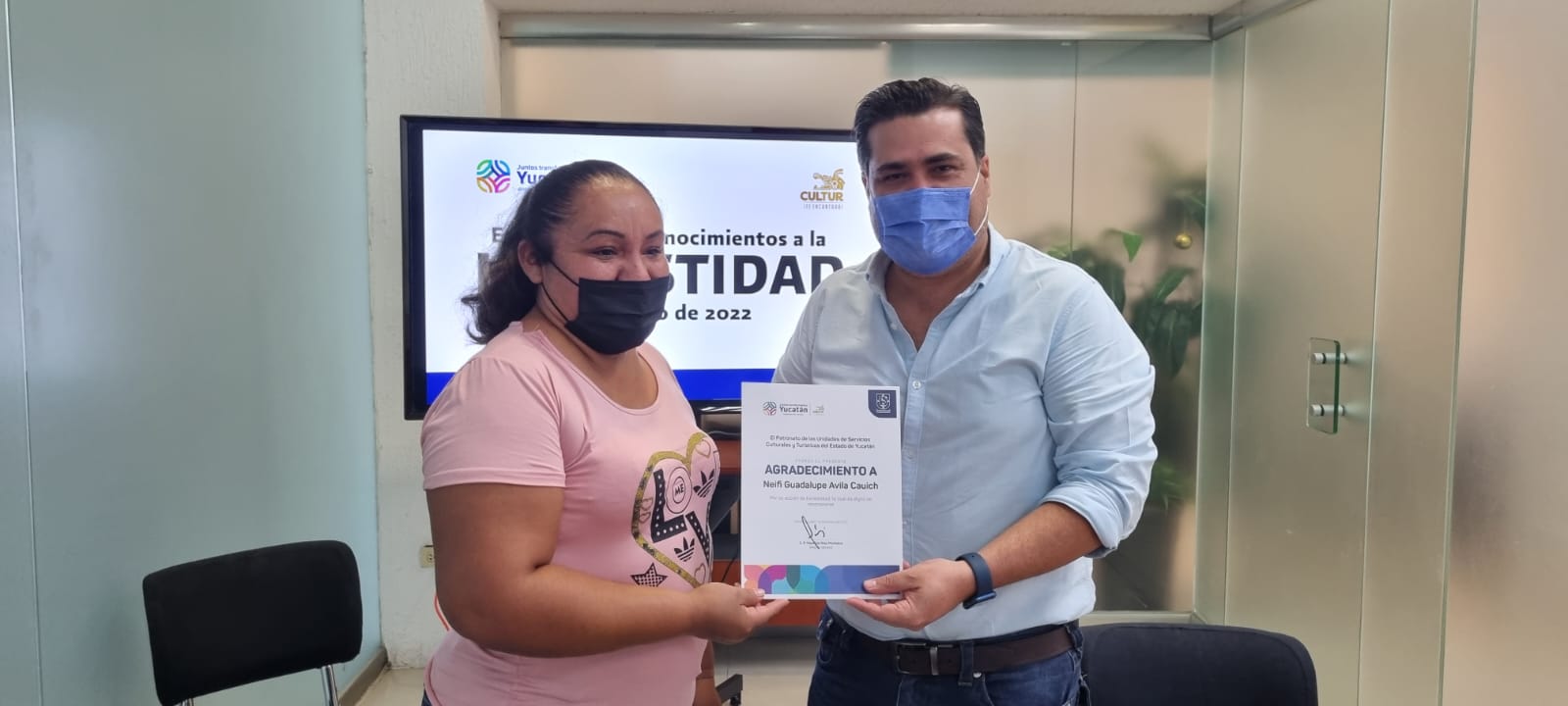 Mérida, Yucatán, a 18 de enero de 2022. Hoy el director general de Cultur, Mauricio Díaz Montalvo, entregó sendos reconocimientos a las intendentes María Viney Coot Canché, Neify Guadalupe Ávida Cauich y Candelaria del Carmen Puga Poot, quienes laboran en los paradores de Dzibilchaltún y Celestún, y en el Centro de Convenciones Siglo XXI, respectivamente, por haber hallado celulares que perdieron turistas y se los devolvieron.