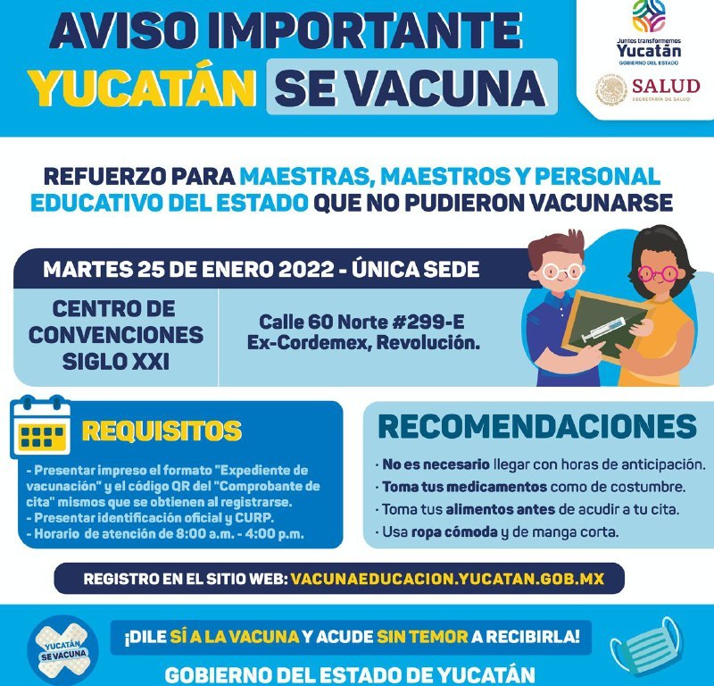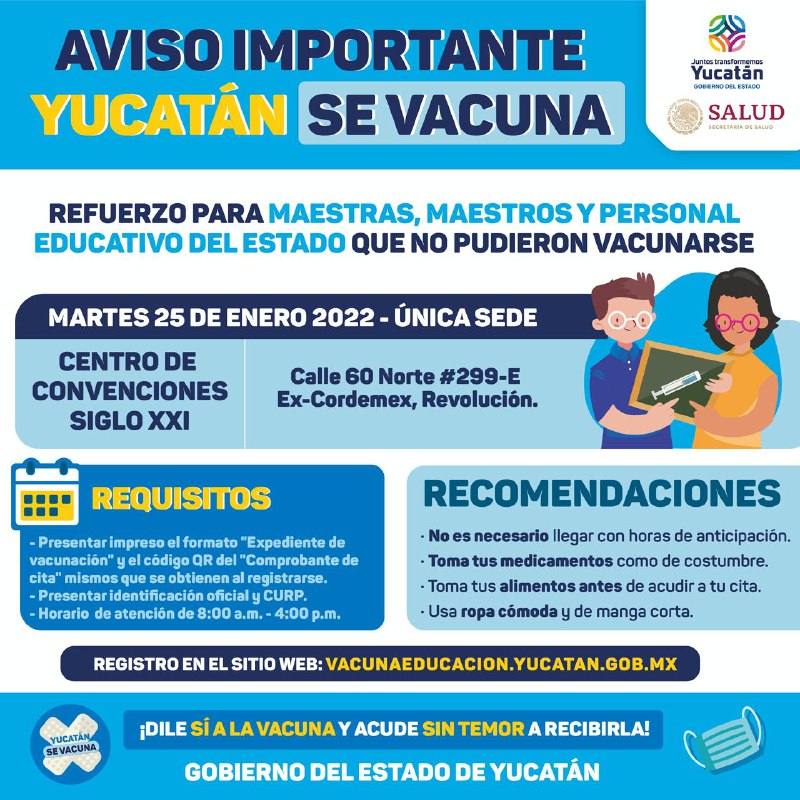 Mérida, Yucatán, 20 de enero de 2022.- Maestras, maestros y personal educativo activo de escuelas públicas y privadas del estado que por algún motivo no pudieron recibir su dosis de refuerzo contra el Coronavirus, tendrán una nueva oportunidad para vacunarse a través una jornada extraordinaria de vacunación que dispuso el Gobernador Mauricio Vila Dosal, la cual se realizará el próximo martes 25 de enero y cuya única sede será el Macrocentro habilitado en el Centro de Convenciones Yucatán Siglo XXI, en un horario de 8 de la mañana a 4 de la tarde.