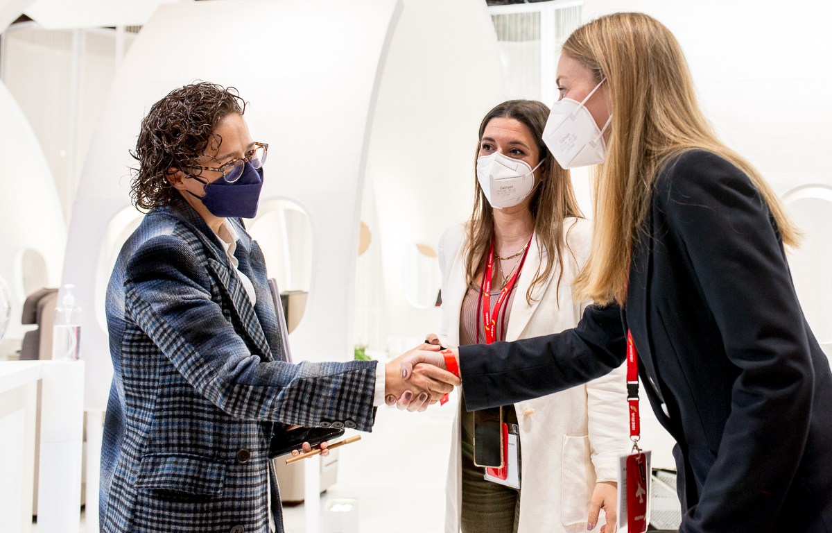 Junto con sus homólogos de Puebla, Oaxaca, Los Cabos, Nuevo León, Riviera Nayarit, Chihuahua y Tabasco, así como otros miembros de la delegación y el secretario de Turismo federal, Miguel Torruco Marqués, la funcionaria acudió al corte de listón del Pabellón de México.