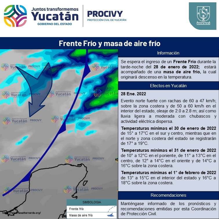 El titular de la dependencia, Enrique Alcocer Basto, anticipó el ingreso de un frente frío y otra masa de aire, por la tarde y noche del viernes 28, como parte de la temporada invernal; según datos del Servicio Meteorológico Nacional (SMN) de la Comisión Nacional del Agua (Conagua), antes de ese día, habrá condiciones de calor, en promedio de 35 grados.