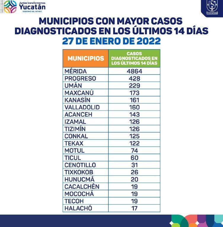 LOS MUNICIPIOS DE YUCATÁN CON MAYOR NÚMERO DE PERSONAS CONTAGIADAS SON (casos acumulados al 27 de enero):