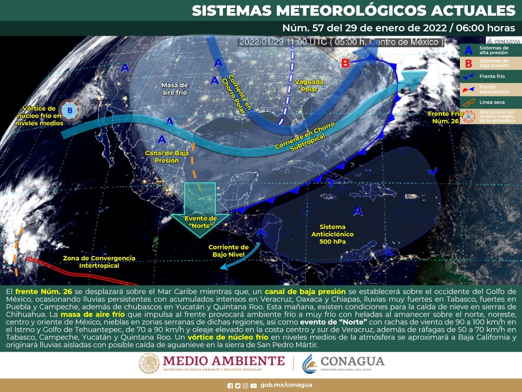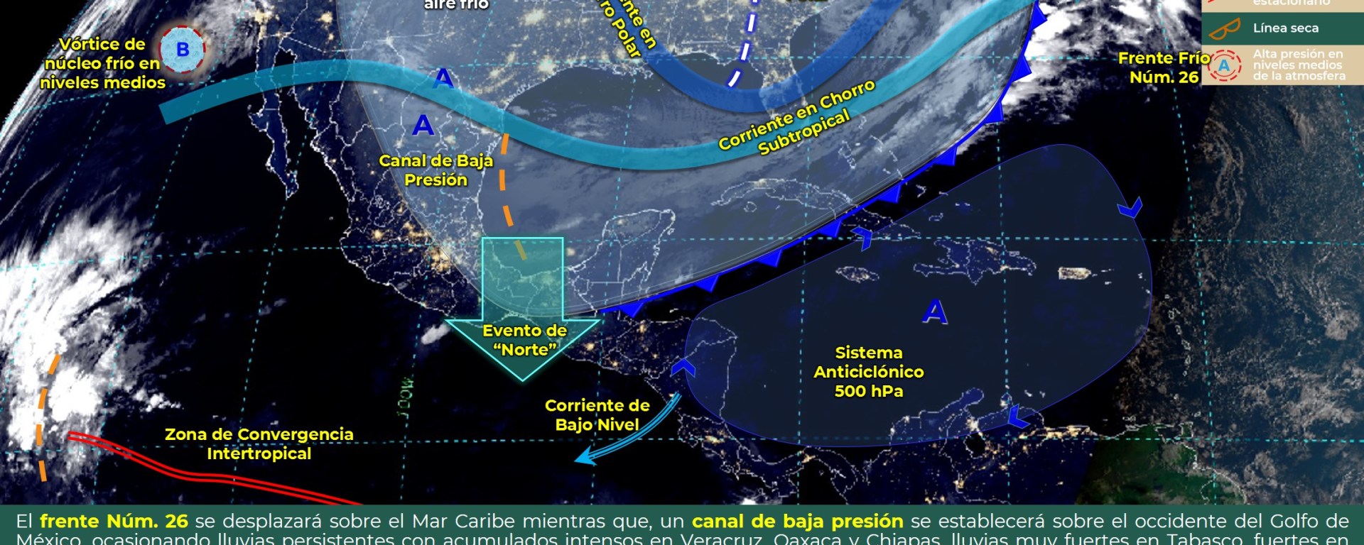 El paso del frente frío No. 26 sobre la península de Yucatán y su vaguada inducida, mantendrán nublados con lluvias intermitentes en el estado de Quintana Roo, dejando acumulados de lluvias fuertes, así como chubascos en el noreste de Yucatán y suroeste de Campeche. El evento de “norte” se mantendrá parte de