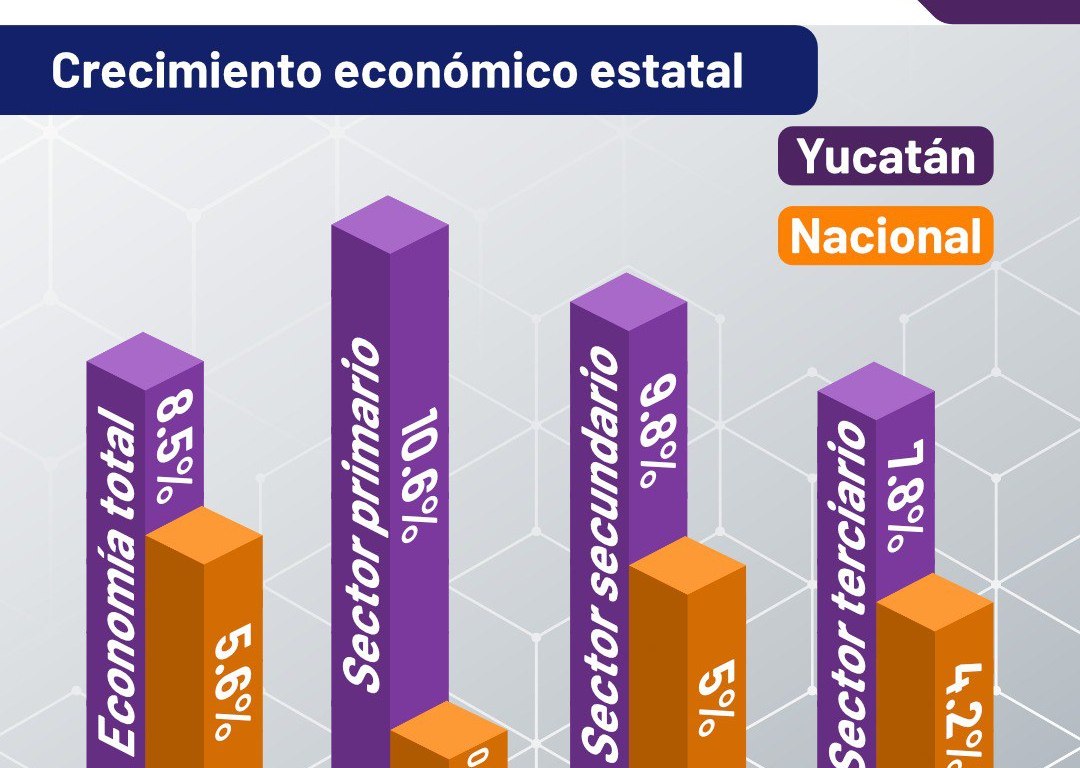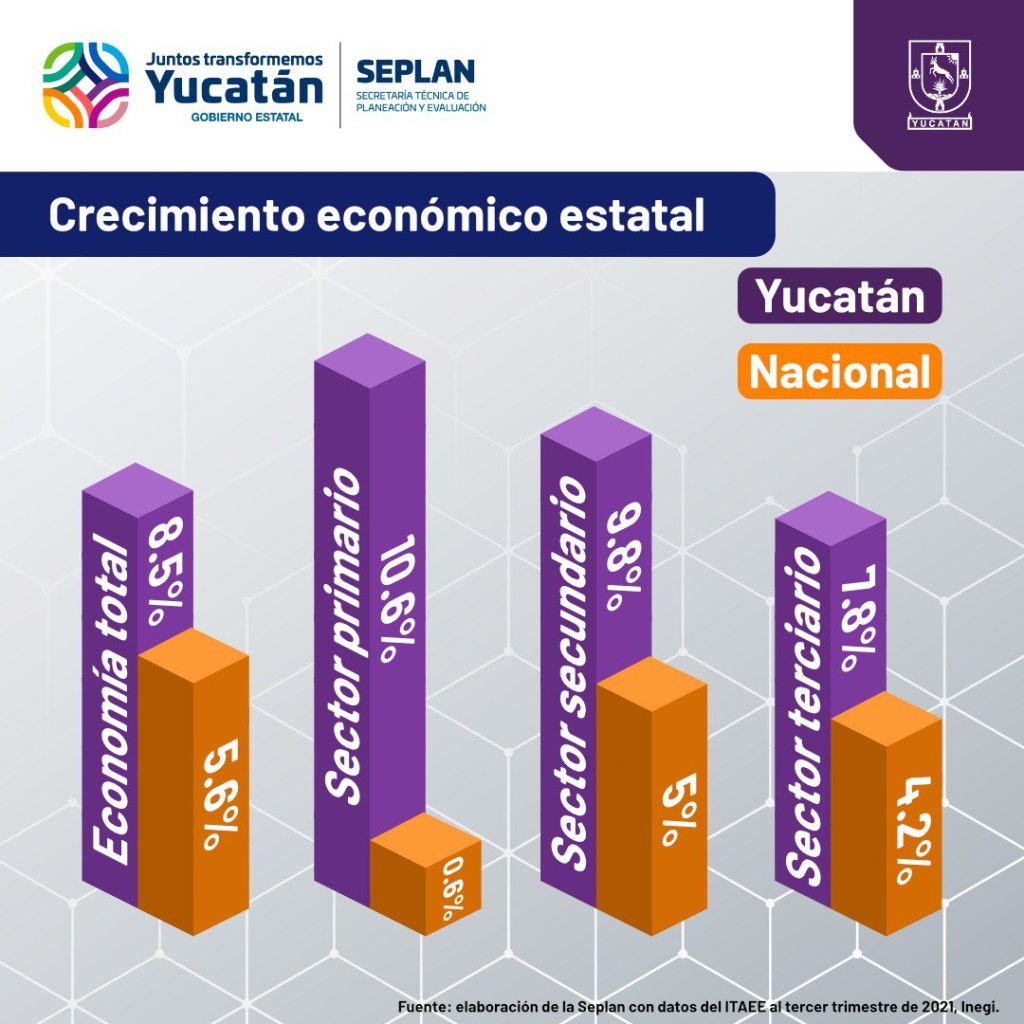 En un análisis anual de Yucatán, el comparativo acumulado de 2021 presentó crecimiento en todos los sectores, siendo el secundario y el terciario los más representativos, con una tasa de 13.2% y 8.2%, de forma respectiva, ocupando el séptimo lugar del país. Por otro lado, el primario subió 4.7%, más de dos veces superior que la suma nacional y aterrizando en el noveno puesto.
