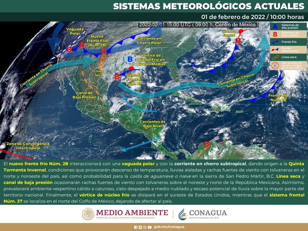 Se prevé que la circulación anticiclónica que cubre el golfo de México y la península de Yucatán, favorecerá el ingreso de aire marítimo tropical hacia el interior de la región, generando condiciones de cielo parcialmente nublado, con probabilidad para lloviznas dispersas a lo largo de la costa de Quintana Roo, así como en el noreste y oriente de Yucatán. Asimismo, debido a que el viento dominante tenderá a cambiar hacia el este-sureste, se espera un incremento en los valores de temperaturas, siendo de cálidas a calurosas durante el día y frescas a templadas al amanecer.