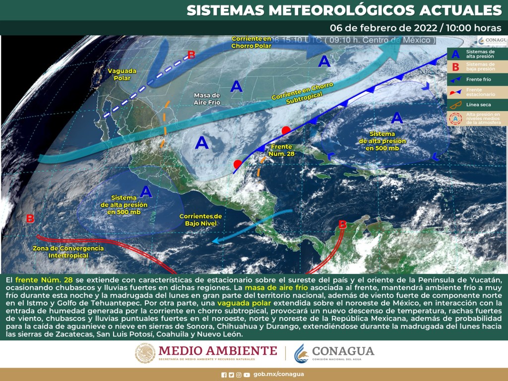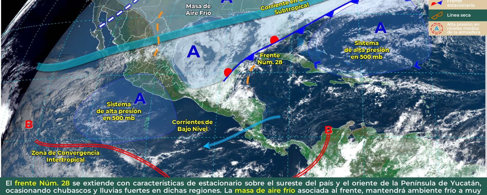 Se prevé que durante las próximas 24 horas, la masa de aire frío que impulsó al frente No. 28 continúe cubriendo la península de Yucatán, manteniendo condiciones de cielo nublado en los tres estados de la región, con probabilidad para chubascos con lluvias fuertes principalmente en el norte y centro de
