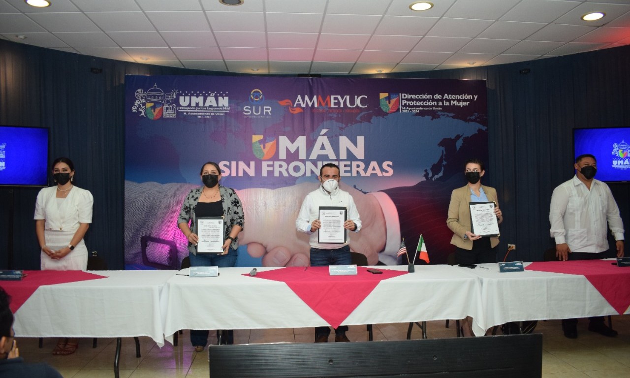 Esta mañana se realizó la firma del convenio «Umán sin Fronteras» que tiene como objetivo contribuir a la equidad de género, mediante estrategias sociales, económicas y de emprendimiento que ayuden a mejorar la calidad de vida de las familias.