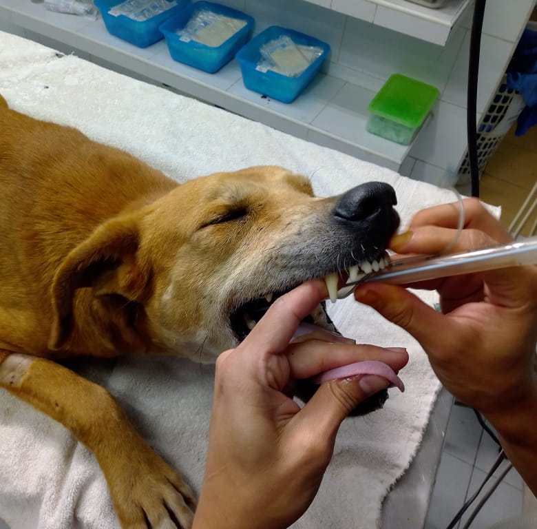 Informó que el animal llegó lleno de pulgas y garrapatas, de manera que se aplicó un medicamento para que se libere de ellas. También se le aplicó la vacuna antirrábica.