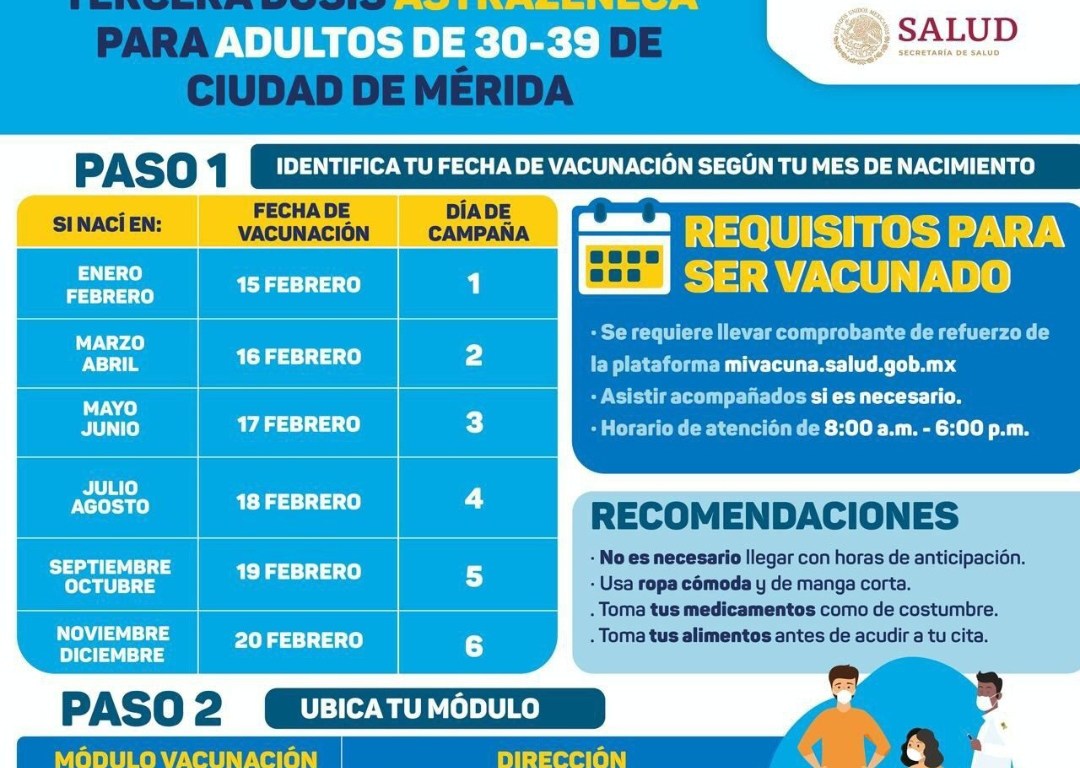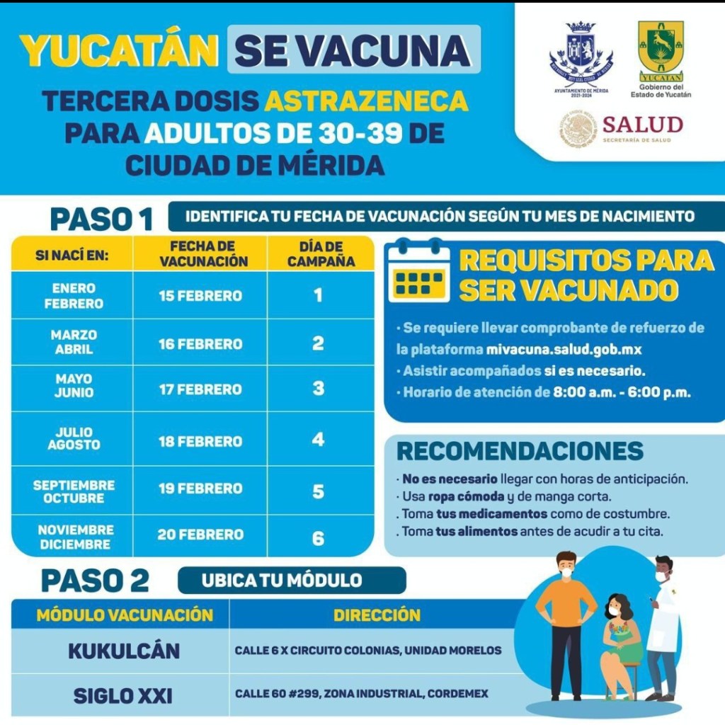 Mérida, Yucatán, 11 de febrero de 2022.- Yucatán continúa avanzando en la campaña de vacunación para cuidar y mantener la salud de su población, por lo que del martes 15 al domingo 20 de febrero, se realizará la aplicación del refuerzo de la vacuna contra el Coronavirus a personas de 30 a 39 años de Mérida, informó la Secretaría de Salud del Estado (SSY).