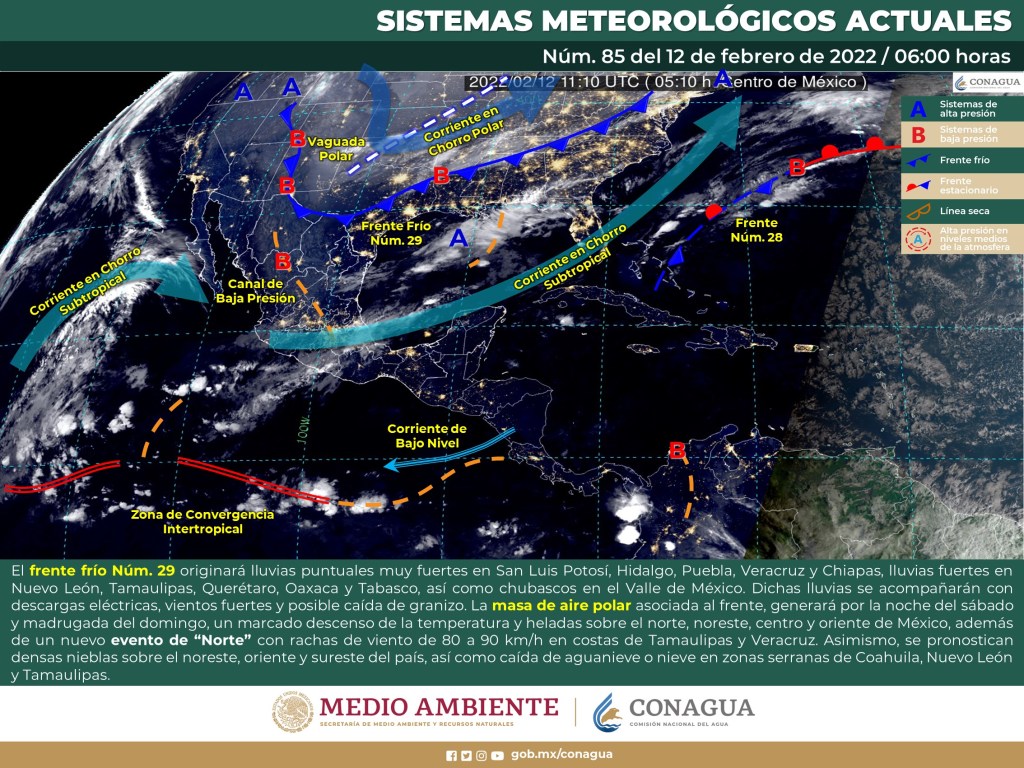Una vaguada se extenderá sobre el norte de la península hasta el occidente, inducida por el frente frío No. 29, el cual se localizará desplazándose sobre el golfo de México, esto favorecerá nublados y tormentas fuertes nocturnas en el centro, norte y noroeste de Yucatán, centro