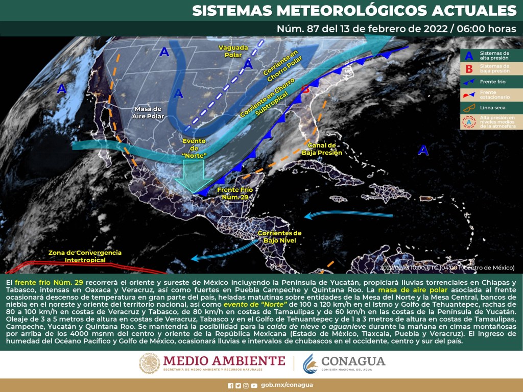 El paso del frente frío No. 29 sobre la península de Yucatán y su vaguada inducida, estarán generando cielo medio nublado con probabilidad para intervalos de chubascos y lluvias puntuales fuertes en municipios del centro y sur de Quintana Roo, chubascos en el sur de Campeche,