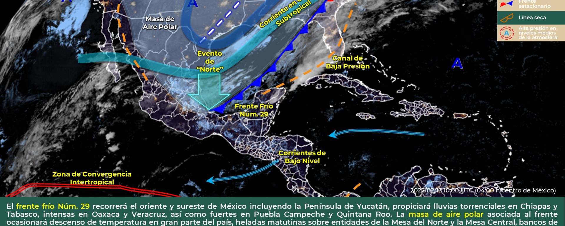 El paso del frente frío No. 29 sobre la península de Yucatán y su vaguada inducida, estarán generando cielo medio nublado con probabilidad para intervalos de chubascos y lluvias puntuales fuertes en municipios del centro y sur de Quintana Roo, chubascos en el sur de Campeche,