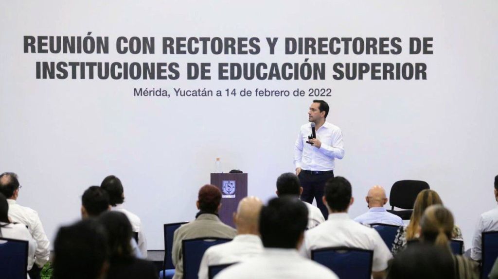 Mérida, Yucatán, 14 de febrero de 2022.- El Gobernador Mauricio Vila Dosal sostuvo un encuentro con rectores y directores de universidades públicas y privadas del estado, donde abordó temas relacionados con el regreso seguro a clases, el panorama actual de la pandemia en la entidad y la prevención y atención de la violencia contra las mujeres u otros grupos en situación vulnerable dentro del ámbito escolar.