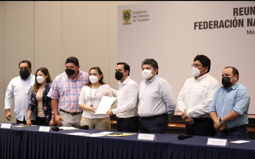 -El Gobernador Mauricio Vila Dosal sostuvo un encuentro con alcaldes integrantes de la Federación Nacional de Municipios de México (Fenamm) en el estado, en el que se acordó continuar trabajando con voluntad política y coordinadamente en favor del desarrollo de los municipios.