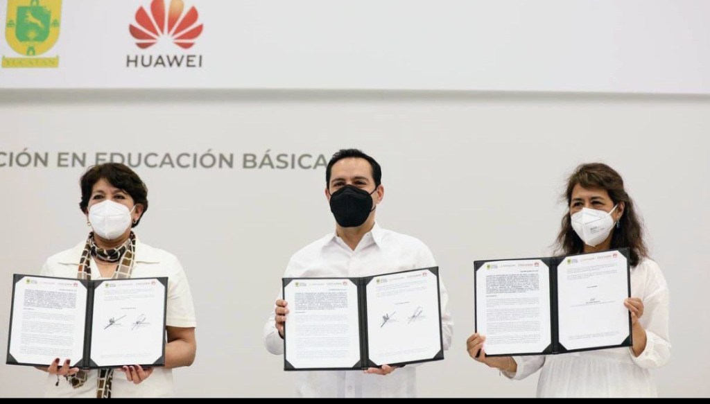 -El Gobernador y la titular de la Secretaría de Educación federal, Delfina Gómez Álvarez, atestiguaron la firma de convenio de la Usicamm con la empresa Huawei, para capacitar a docentes yucatecos en habilidades digitales.