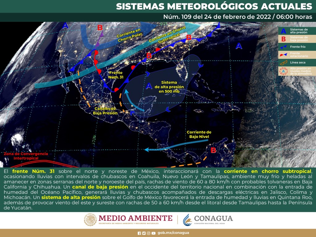 Durante las próximas 24 horas, se prevé que se presenten condiciones de tiempo estable con cielo despejado a parcialmente en los tres estados de la región, debido al dominio de un extenso sistema anticiclónico sobre la península de Yucatán y golfo de México, sin embargo, derivado del ingreso de aire