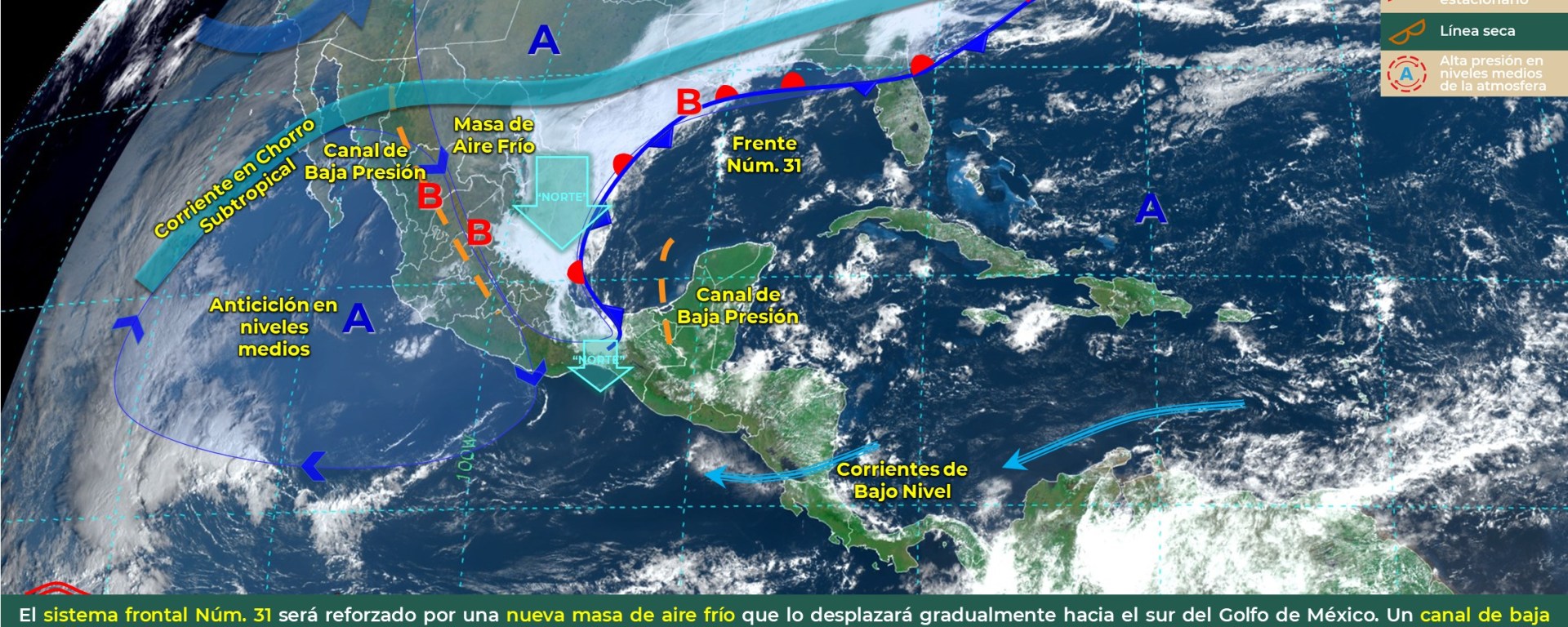Yucatán, se presenten condiciones de cielo parcialmente nublado, con probabilidad para intervalos de chubascos en el centro y sur de Quintana Roo, así como lloviznas aisladas en el noreste de Yucatán y el sur y suroeste de Campeche. Asimismo, se pronostica un ambiente caluroso en el día, cálido por la noche, con viento dominante del este-noreste de 15 a 25 km/h, cambiando al noreste por la tarde con rachas mayores a 45 km/h principalmente sobre la costa de Campeche.