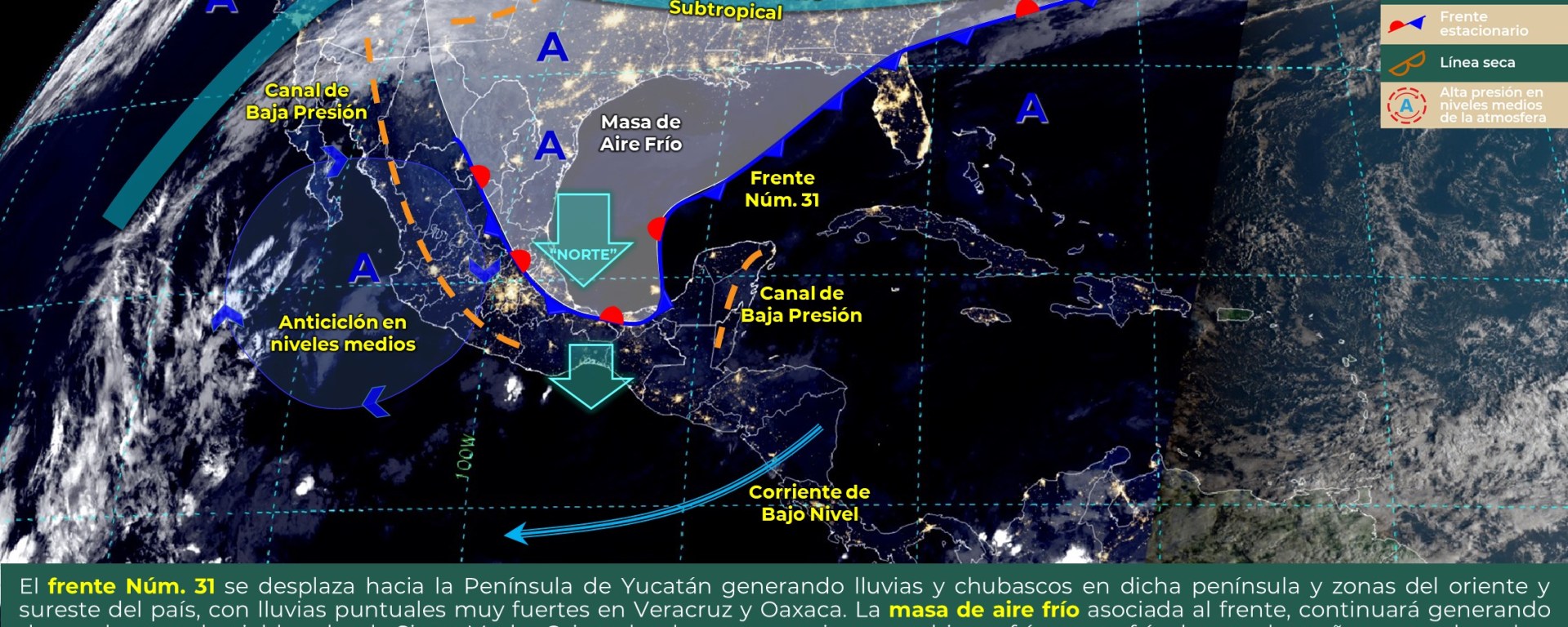 La cercanía del sistema frontal No.31 a la península de Yucatán y el ingreso de aire marítimo tropical hacia la región, generarán condiciones de cielo despejado a parcialmente nublado con probabilidad para lloviznas e intervalos de lluvia en Yucatán, Campeche y Quintana Roo.