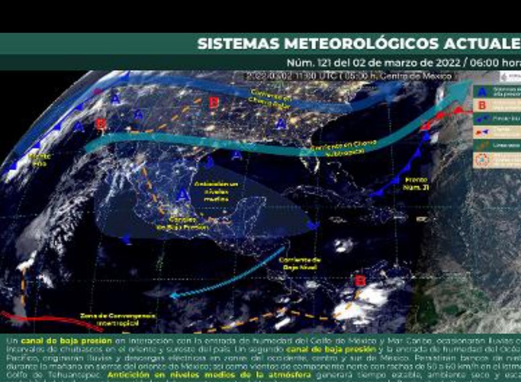 Se prevé que se presenten condiciones de tiempo estable con cielo despejado a parcialmente nublado, así como escasa probabilidad para lluvias en los tres estados de la región, debido al dominio de un sistema anticiclónico en niveles medios de la tropósfera. El ambiente será cálido a caluroso en el día y templado a cálido durante la madrugada. Viento de dirección norte-noreste de 15 a 25 km/h y rachas de 45 km/h en zonas costeras.