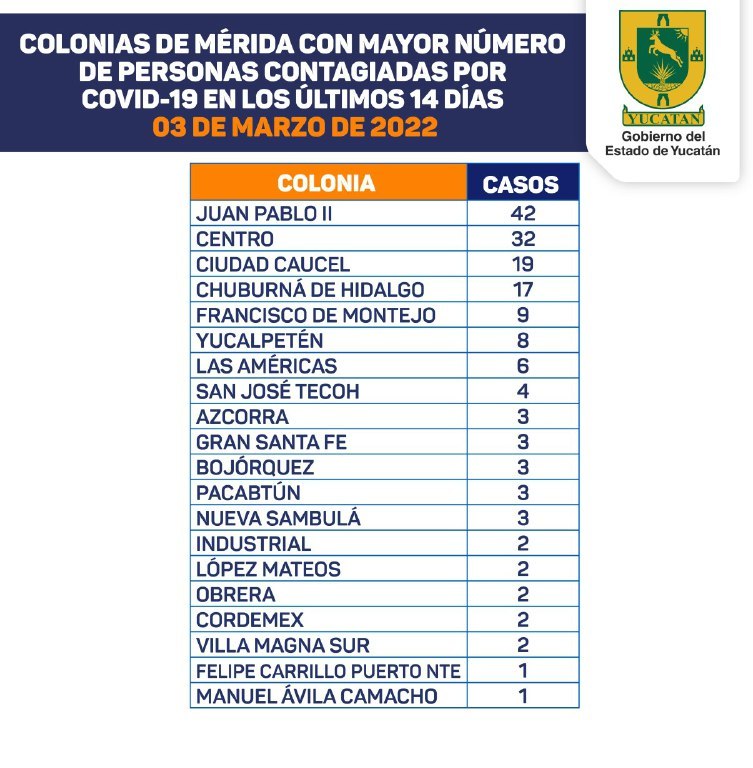 LAS COLONIAS DE MÉRIDA CON MAYOR NÚMERO DE PERSONAS CONTAGIADAS EN LOS ÚLTIMOS 14 DÍAS SON: