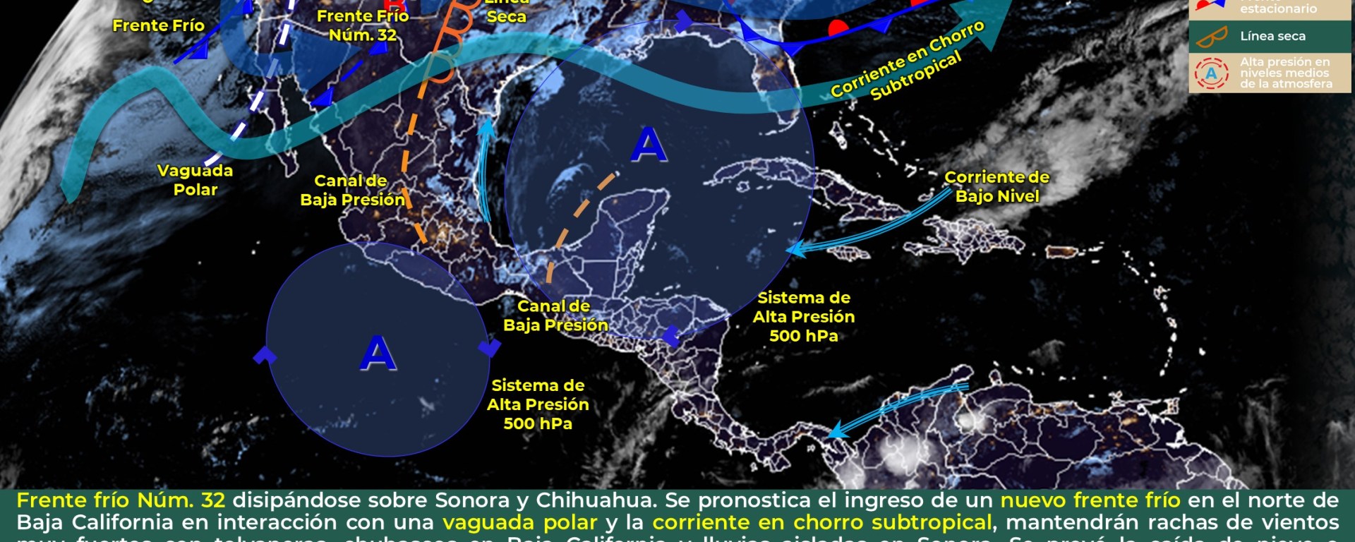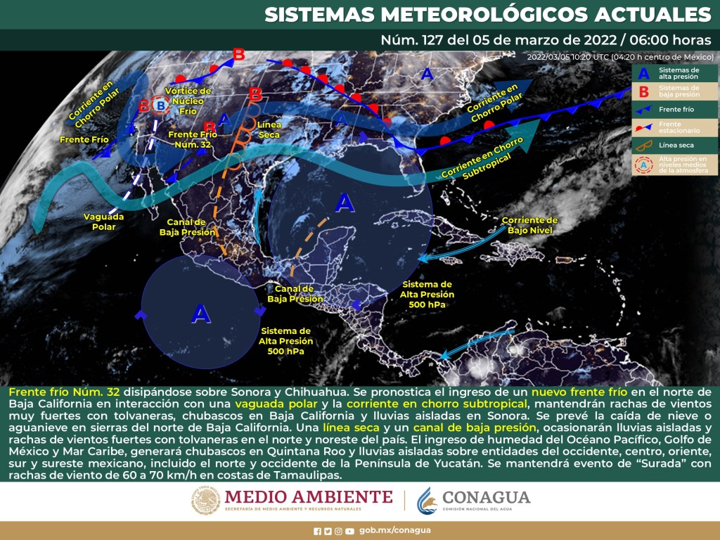 Se prevé que una circulación anticiclónica en niveles medios de la atmosfera, cubrirá parte de la península de Yucatán, lo que favorecerá condiciones de tiempo estables, muy baja probabilidad para lluvias en el centro y sur de Quintana Roo, y sin lluvias en el resto de la península. Ambiente caluroso en el día y templado al amanecer. Vientos dominantes del este-sureste de 15 a 25 km/h y rachas de 45 km/h en el litoral costero.