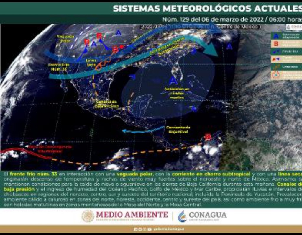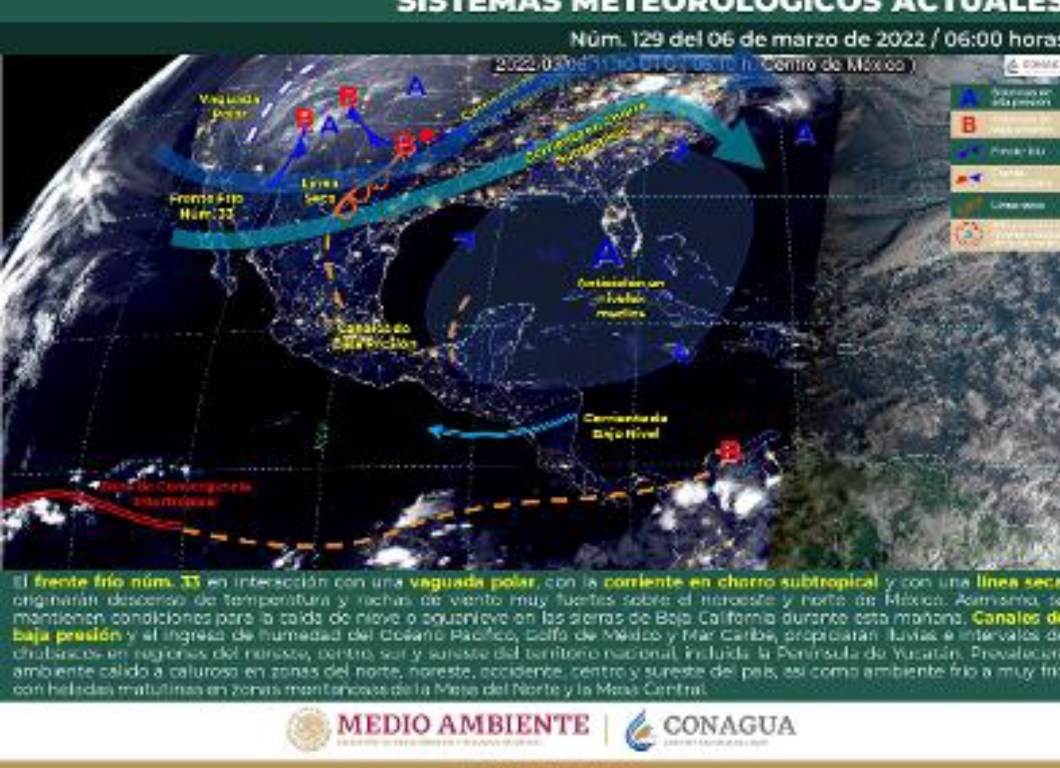 Se prevé que una dorsal de la circulación de un sistema de alta presión, estará generando evento de surada, por lo que se prevé un incremento de las temperaturas, asimismo el ingreso de humedad estará generando nublados dispersos y lluvias aisladas en el centro y sur de Quintana Roo, en el resto de la región no se prevén lluvias. Temperaturas muy calurosas en el día y cálidas en la madrugada, viento de dirección sureste de 15 a 25 km/h y rachas superando los 50 km/h en el litoral costero.
