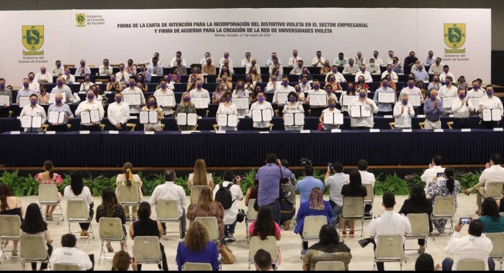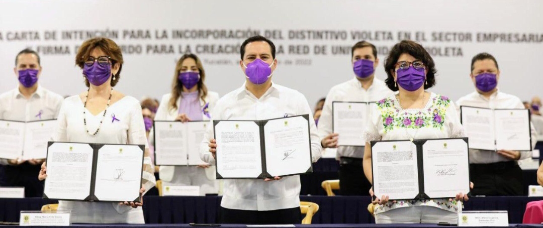 Mérida, Yucatán, 7 de marzo de 2022.- Con el objetivo de promover espacios seguros y libres de violencia contra las mujeres, el Gobierno de Mauricio Vila Dosal firmó acuerdos de colaboración con las cámaras empresariales locales para la incorporación del Distintivo Violeta en sus centros de trabajo, y con instituciones de educación superior para la creación de la Red de Universidades Violeta, iniciativas que permitirán la implementación de acciones y mecanismos para la prevención, atención y denuncia de esta problemática, en los ámbitos laboral y académico.